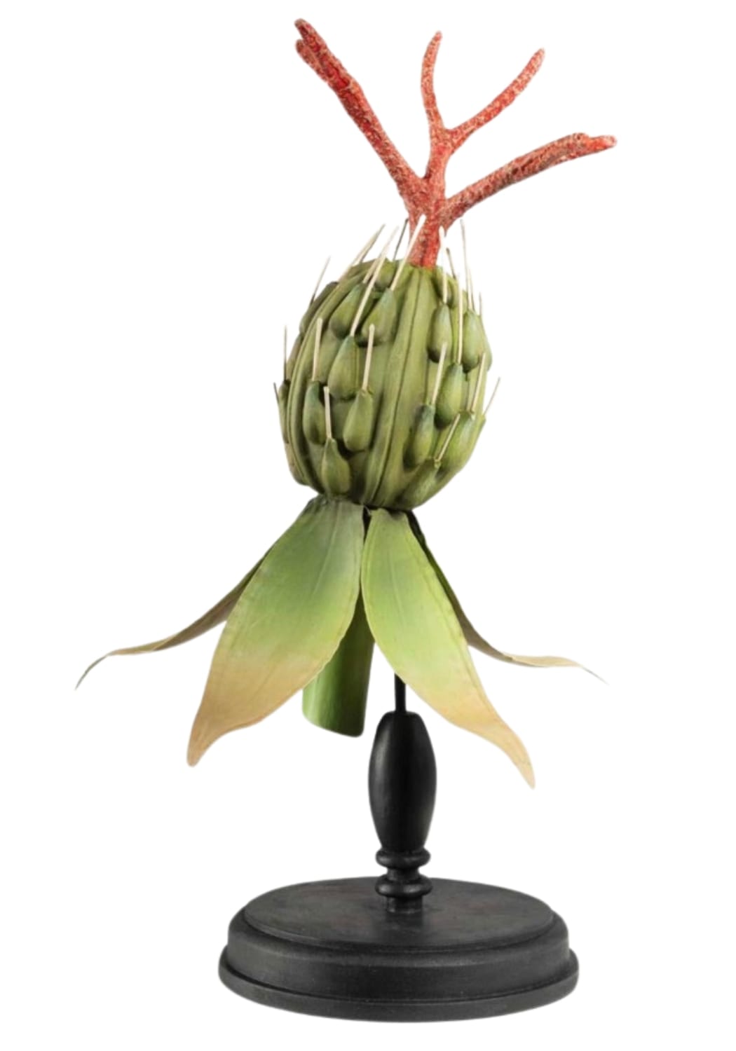 This intriguing botanical specimen captures the unique form of an exotic seedpod. Its green bulbous body, delicate tendrils, and vibrant red filaments create a striking contrast atop a sleek black stand. Perfect for nature enthusiasts or as a conversation piece, this model adds a touch of botanical curiosity to any shelf, desk, or curio display.
