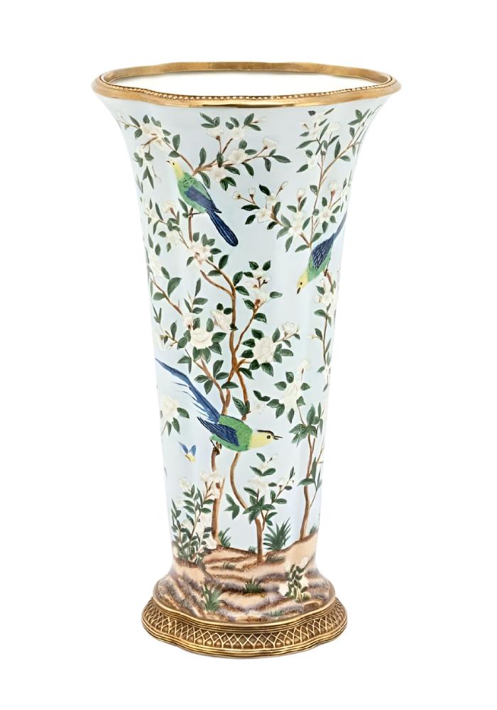 Elevate your space with the timeless elegance of this Oversized Cloisonné-Style Vase, a stunning fusion of traditional craftsmanship and refined design. This statement piece features gracefully curved sides adorned with a delicate, hand-painted bird motif—each bird rendered in vivid detail among blooming branches and soft, natural tones.