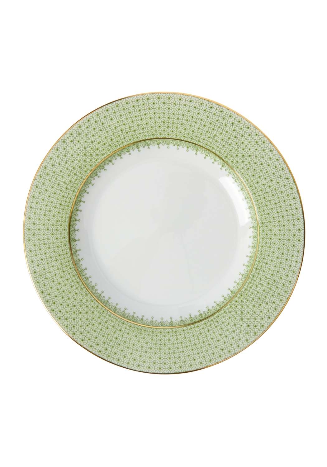 A set of four apple green lace porcelain plates with an exquisite border design and a 22-karat gold band.