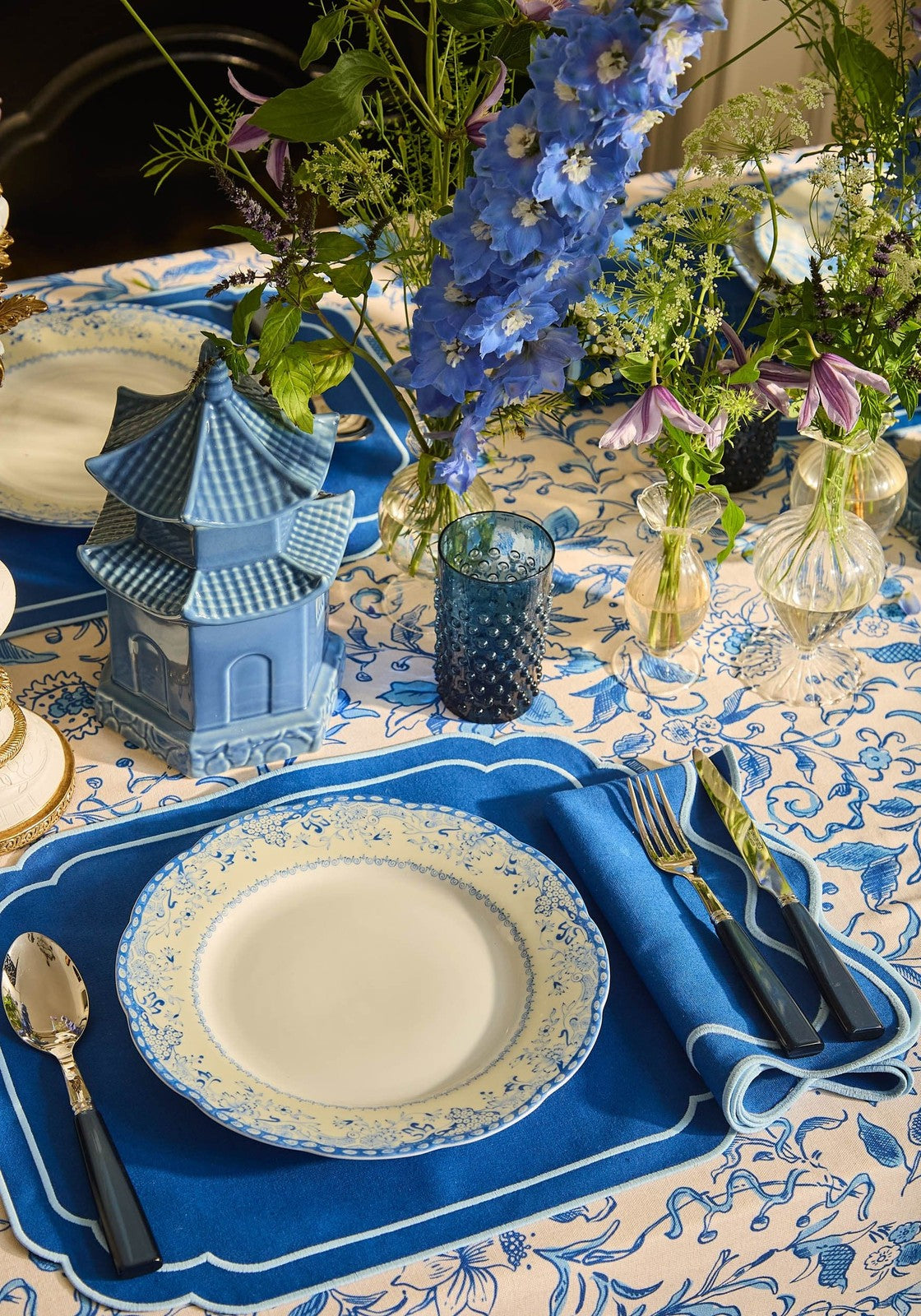 JJ suggests layering it atop our Belgravia Bloom Blue Cotton Tablecloth, then adding the White & Gold Parrot Candle Holder and Anais Sapphire Serenity Temple Pagoda for a tablescape that transports you straight to the Mediterranean.