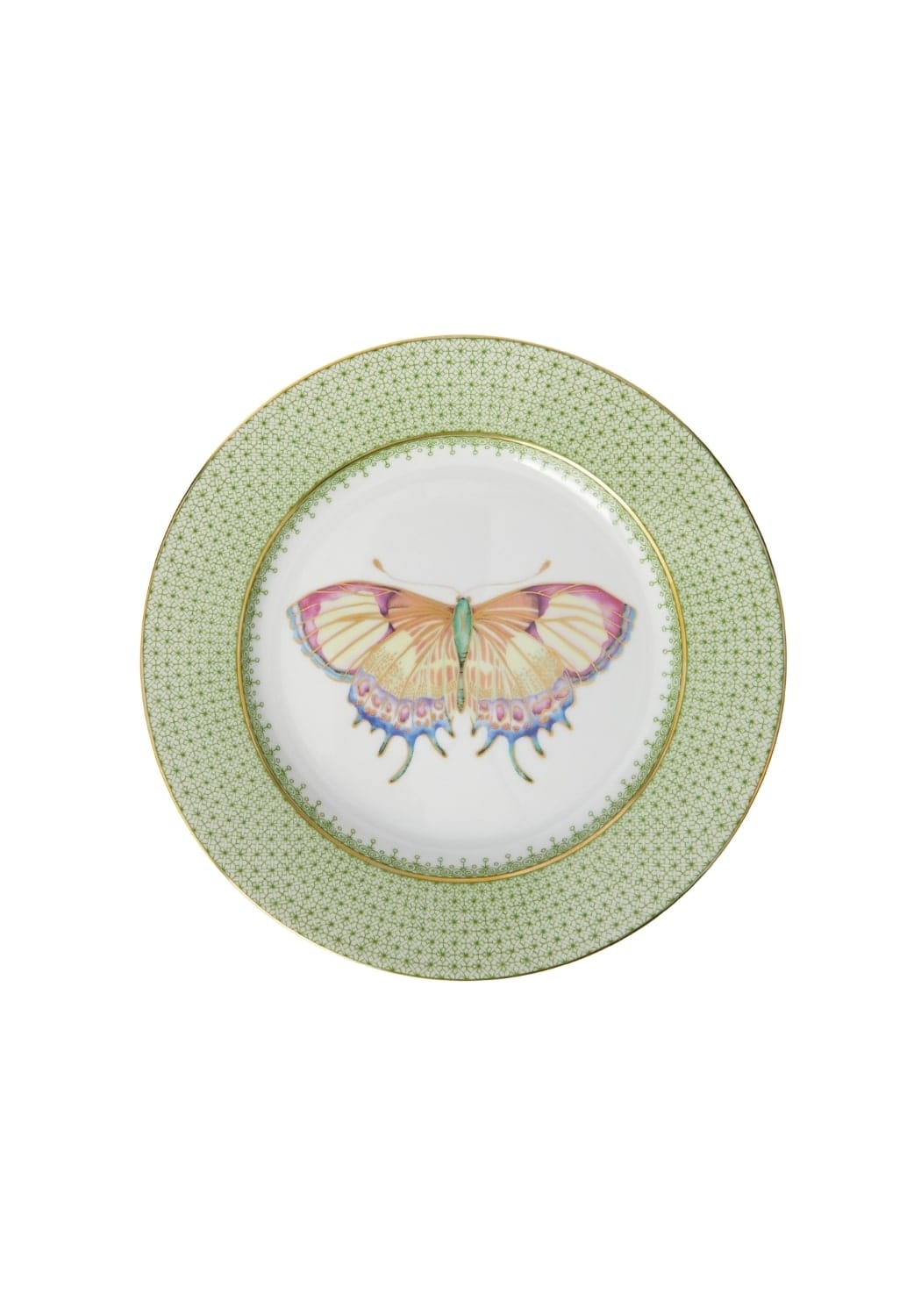 A set of four apple green lace porcelain plates with an exquisite border design and a 22-karat gold band that perfectly pairs with our set of 4 butterfly side pudding plates.