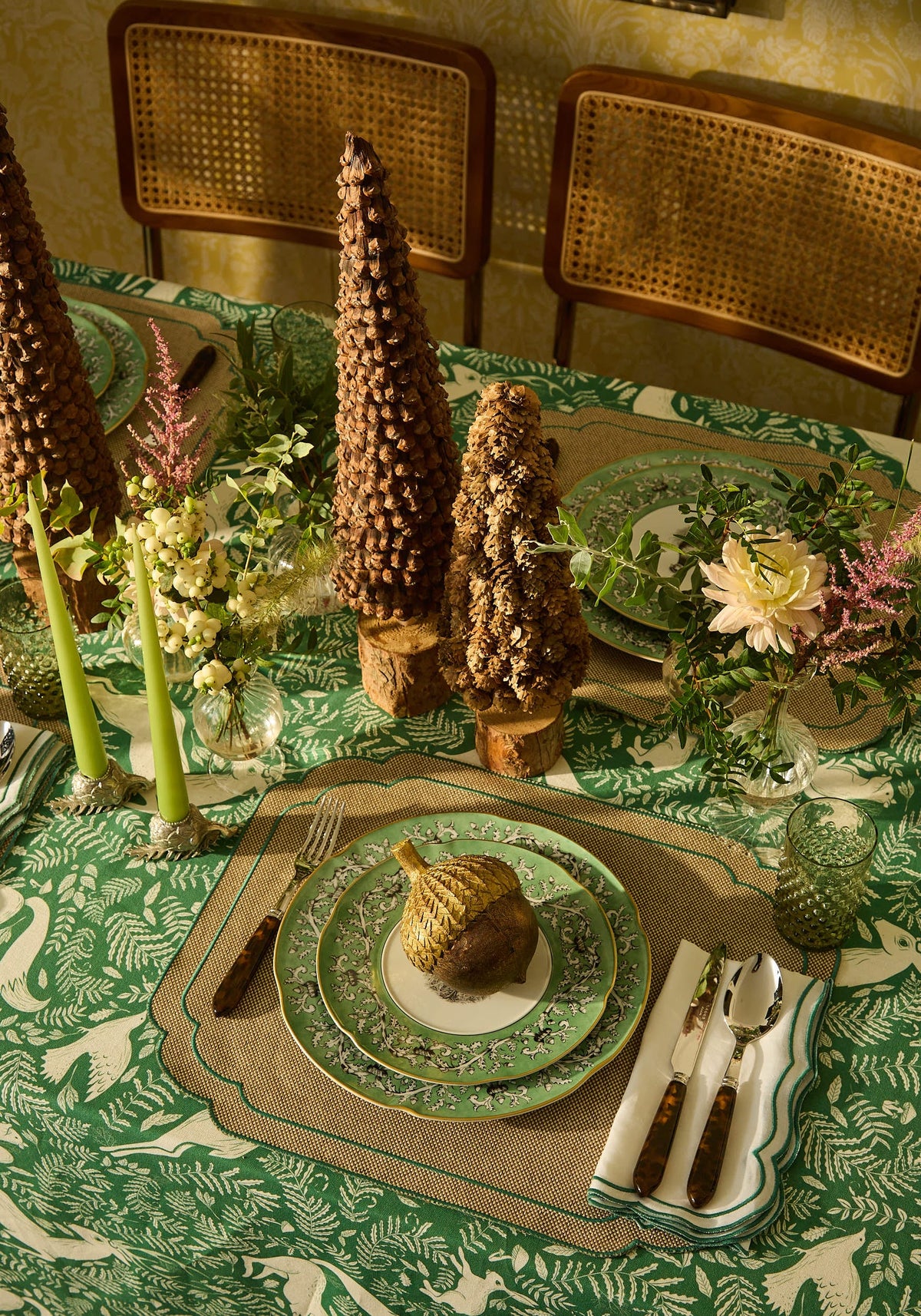 Bring the forest to your table with the Wycliffe Woodland Green Tablecloth, where wildlife peeks from every corner.