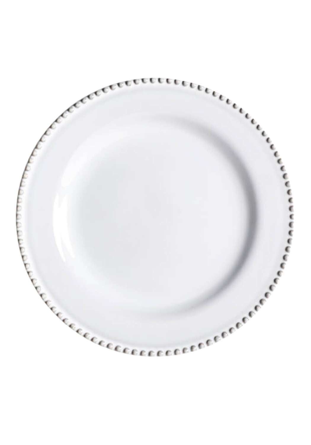 This bobble dinnerware collection offers a sophisticated off-white dinner plate with a smooth, glossy glaze and beaded edge detailing, handcrafted in Portugal as part of a luxurious dining set that includes matching side plates and bowls.