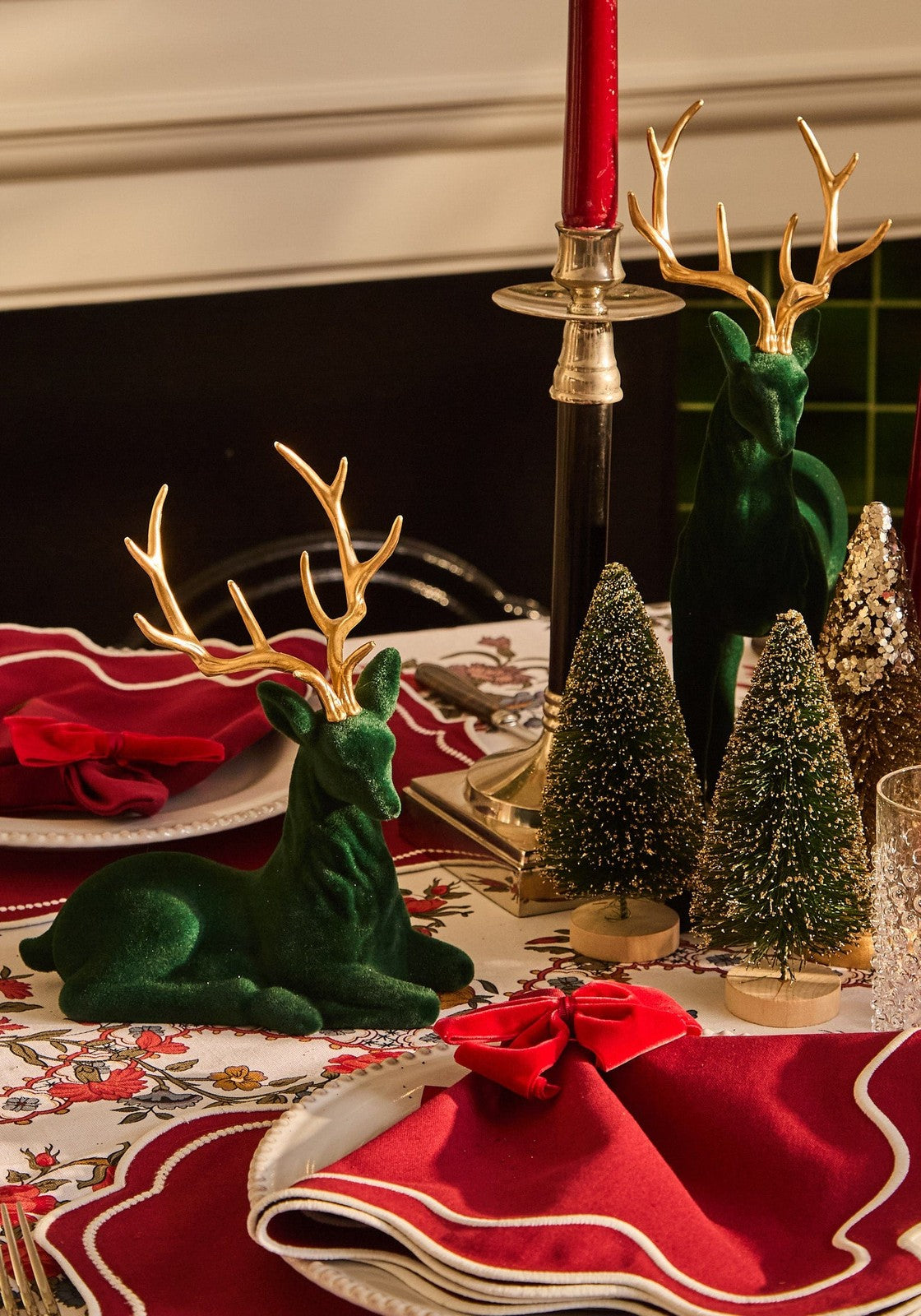 Rich emerald flocking and natural antlers define this serene duo, offered in two complementary sizes. Display them together for a layered statement or scatter them throughout your space for a cohesive winter narrative that lingers long after the holidays.