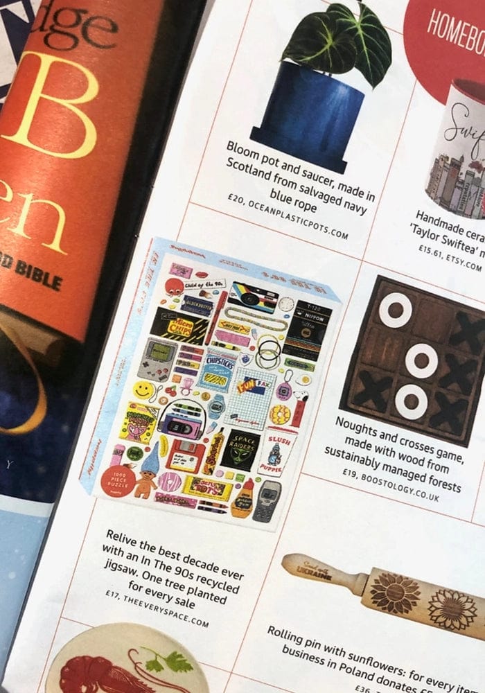 This 1,000-piece puzzle showcases a nostalgic 90's illustration by Holly Maguire, eco-friendly produced in the Netherlands with sustainable materials and zero plastic, perfect for retro enthusiasts and featured in The Guardian's 2023 Christmas Gift Guide.