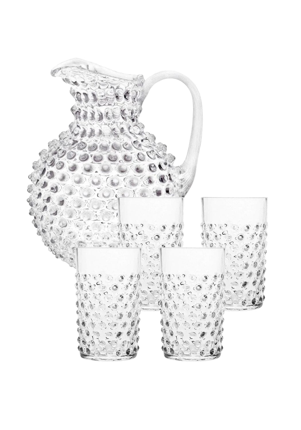 The matching clear glasses add a touch of sophistication to your table. With their classic hobnail design, they're the perfect size for a refreshing drink, great for both kids and adults alike. T
