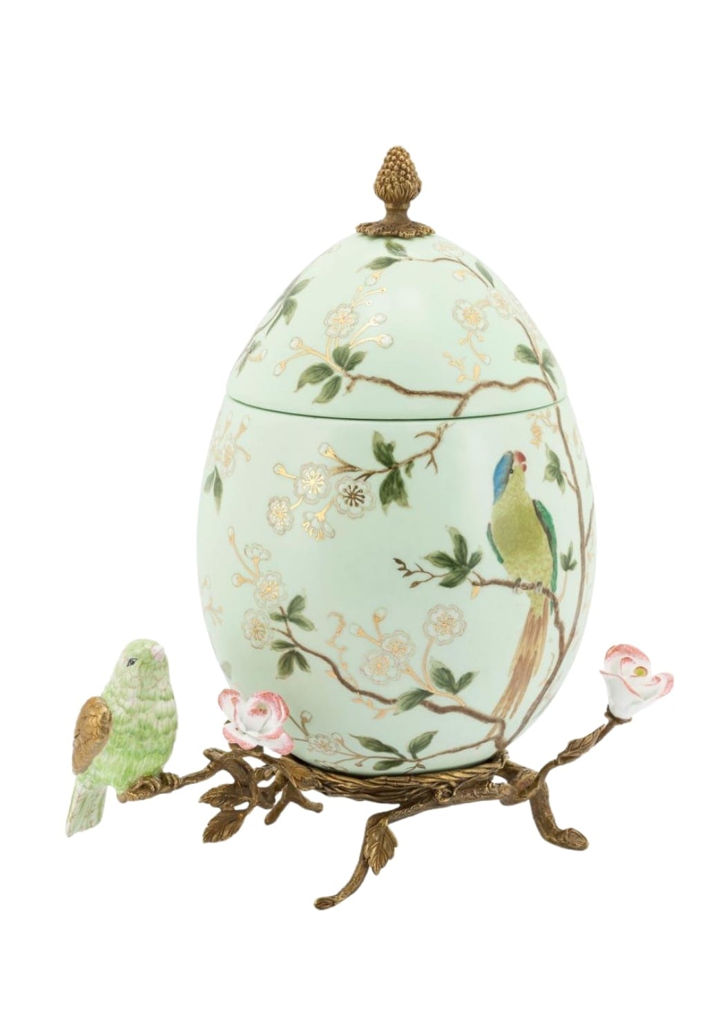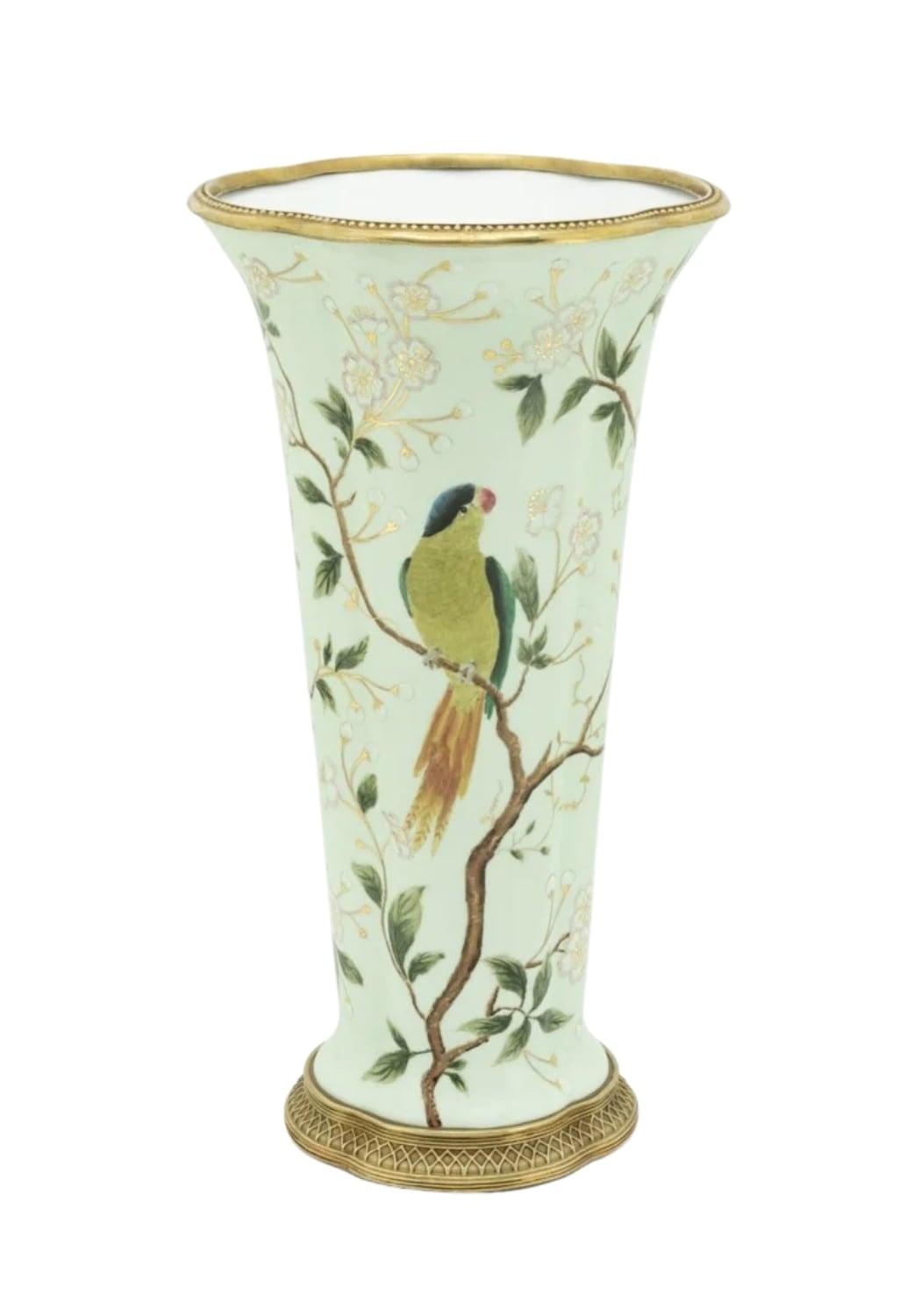A beautiful collection of decorative porcelain pieces, designed for an elegant interior. The dominant color scheme is a soft, delicate mint green and celadon, adorned with intricate, hand-painted botanical and avian motifs. Gold accents are used throughout, adding a touch of luxury and highlighting the details.