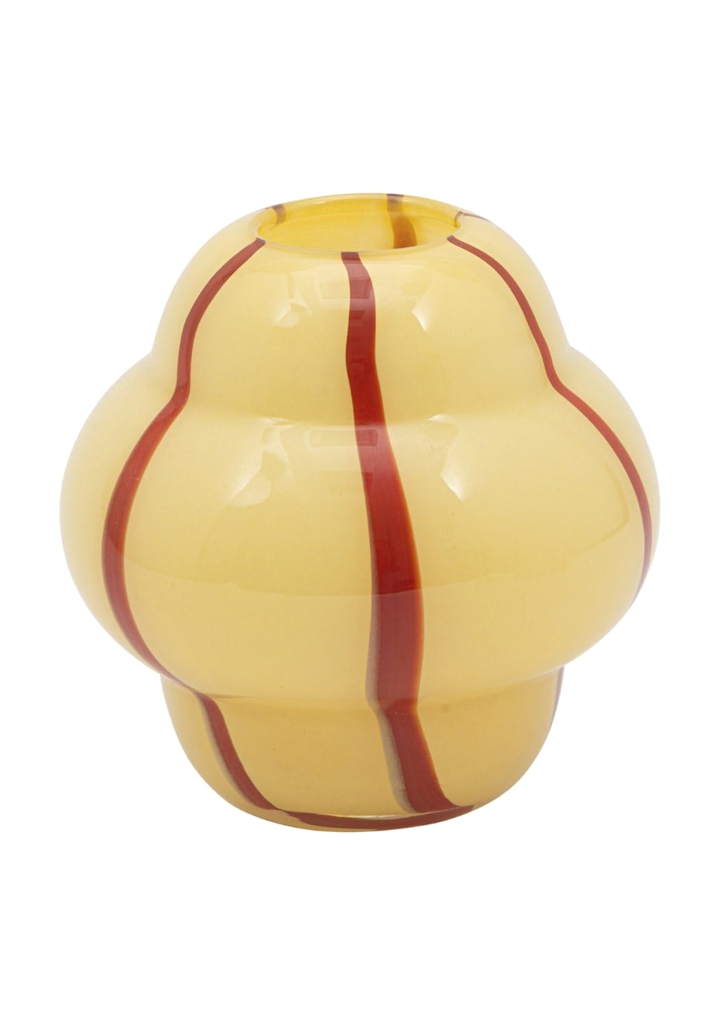 Perfectly charming with or without flowers. This butter yellow glass vase combines a creamy white base with swirls of warm colour, creating a striking visual contrast. Its organic shape and artistic design make it a versatile accent piece for various interior styles.