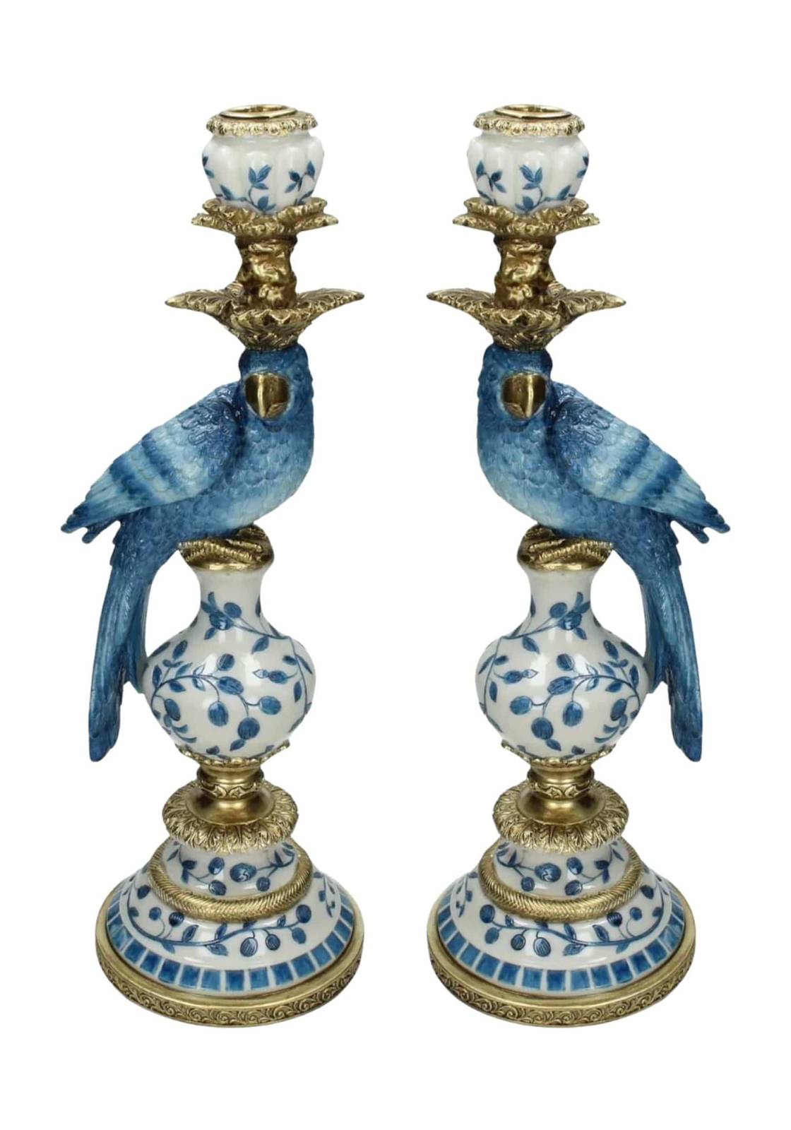 This exquisite candle holder features a lifelike blue parrot perched atop an ornate gold stand, blending whimsy with elegance. The intricate design combines delicate blue and white floral patterns with luxurious gold accents, creating a stunning centrepiece that doubles as a functional candle holder and a captivating conversation piece for any room.